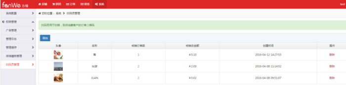 2、在掃碼員管理頁面,展示所有掃碼員掃碼信息,包括掃碼員頭像、名稱、核銷訂單數(shù)、核銷總金額等信息