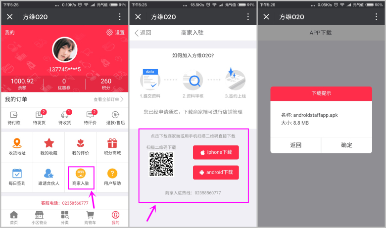 操作步驟:登錄方維社區(qū) O2O 系統(tǒng)wap端前臺 → 點擊我的界面 → 點擊商家入駐 → 下載相應(yīng)安裝包 → 完成
