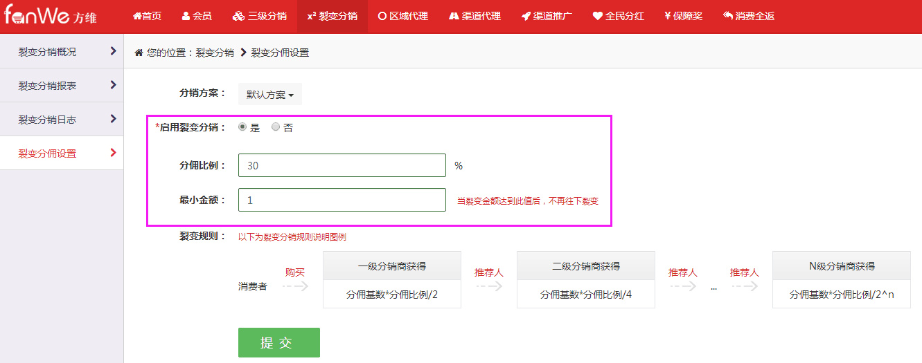商家只要在方維人人電商系統(tǒng)pc端后臺(tái)的分銷方案設(shè)置界面,勾選啟用裂變分銷,再設(shè)置分傭比例及最小金額,最后點(diǎn)擊提交就可以啦~