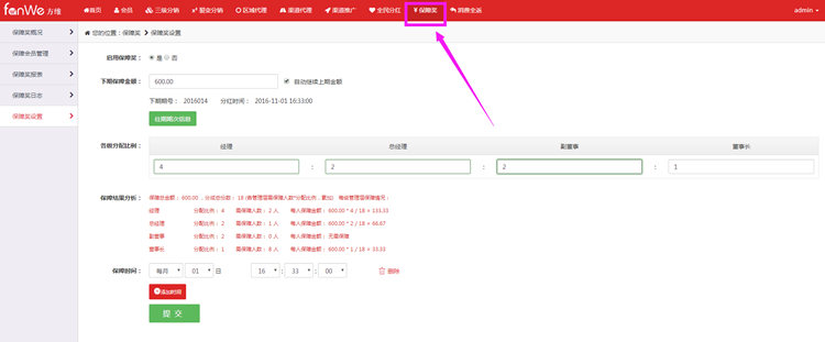 只要根據方維君的步驟,在后臺設置好保障獎的分紅比例、分紅時間等信息,一個完整的金字塔獎勵制度就誕生了呢~