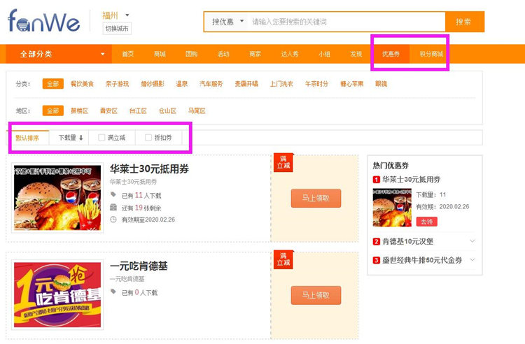 用戶操作步驟:登錄方維O2O城市生活系統(tǒng) →選擇優(yōu)惠券 → 瀏覽并選擇相應(yīng)優(yōu)惠券進(jìn)行領(lǐng)取 → 完成