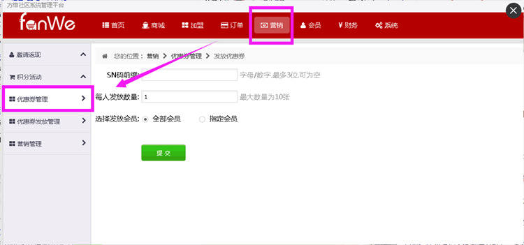 操作步驟:平臺(tái)方登錄方維社區(qū)O2O系統(tǒng)總后臺(tái) → 營(yíng)銷 → 優(yōu)惠券管理 → 自定義編輯優(yōu)惠券發(fā)放設(shè)置 → 設(shè)置發(fā)放數(shù)量→ 勾選全部會(huì)員 →提交 → 完成