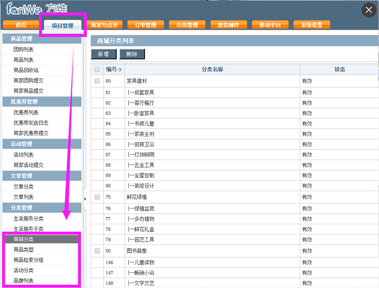 平臺(tái)方操作步驟:平臺(tái)方登錄方維城市O2O系統(tǒng)后臺(tái)→ 項(xiàng)目管理 → 商城分類(lèi) → 自定義編輯商城分類(lèi) → 完成