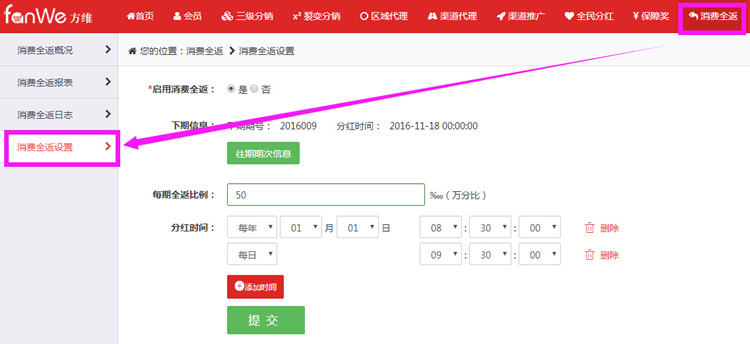 商家按照上述步驟,進(jìn)入方維直銷系統(tǒng)商家端后臺啟用渠道推廣,再根據(jù)平臺自身情況對消費全返功能各個模塊數(shù)據(jù)進(jìn)行自定義編輯,最后點擊提交即可。