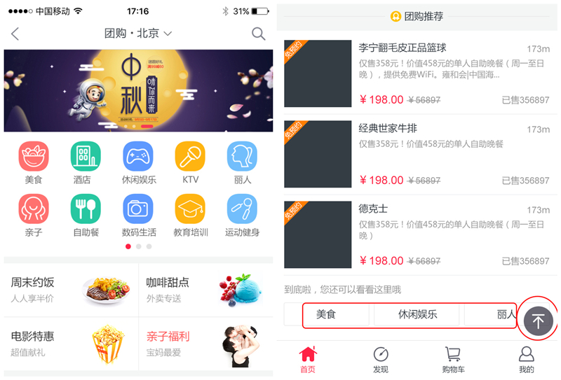 新增的團(tuán)購首頁,同樣也以單獨(dú)且完整的頁面展示,其功能更齊全、布局更加多元化。在頁面最底部,增加人性化分類標(biāo)簽和置頂按鈕,讓用戶一鍵訪問其他頁面,無需手動滑至頁面頂端,體驗(yàn)更流暢。