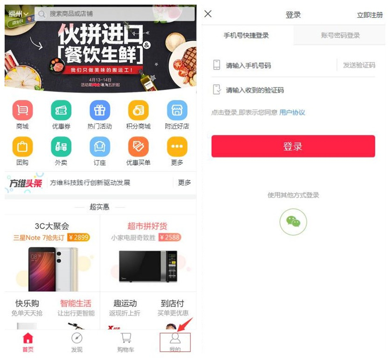 用戶點(diǎn)擊任意頁面右下角:我的,即可跳轉(zhuǎn)登錄頁面。若需通過第三方(微信)登錄,則要綁定手機(jī)號,從而為商家達(dá)到增加用戶的目的。
