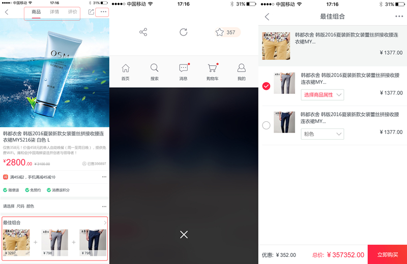 點(diǎn)擊右上角,可對商品進(jìn)行分享、刷新、收藏,增加了用戶主動傳播的途徑,拓寬吸粉渠道,也讓用戶收藏寶貝買買買更簡單;另外在最佳組合模塊,平臺商家可根據(jù)營銷計(jì)劃進(jìn)行針對性的捆綁銷售,以優(yōu)惠套餐形式引導(dǎo)用戶進(jìn)行購買,同時(shí)用戶可按個(gè)人喜好自行添加或刪除想要購買的商品。
