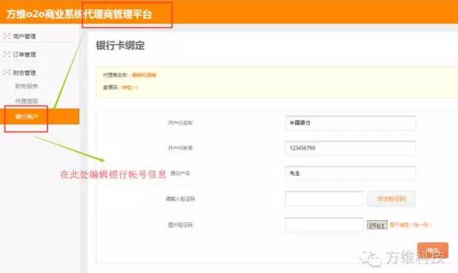 登陸代理商管理平臺后,根據(jù)銀行賬戶-銀行卡綁定-消息填寫-輸入驗證碼-點擊修改的步驟,就可以輕松快捷地綁定銀行卡了!同樣的,登陸代理商管理平臺后,依次點擊-代理提現(xiàn),輸入驗證碼后,即可提取余額現(xiàn)金哦~真是相當?shù)胤奖恪?/span>