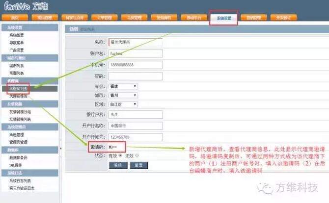登入方維城市O2O管理后臺,依次點擊系統(tǒng)設置-代理商列表-新增,即可編輯代理商的區(qū)域、權限和各類信息,一目了然,操作十分簡單快捷。
