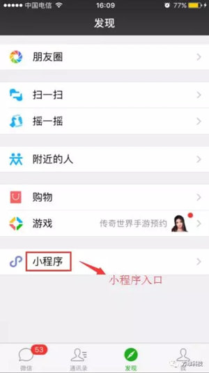 小程序是一種“無需安裝、觸手可及、用完即走、無需卸載”的手機(jī)應(yīng)用,在最新版本的微信(6.5.3)中打開“發(fā)現(xiàn)”頁(yè)面就可以獲得小程序入口。