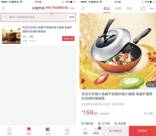 會(huì)員可以搜索自己想代理的商品;查看商品詳情的時(shí)候,也可以直接進(jìn)行購(gòu)買(mǎi),消費(fèi)更加方便。