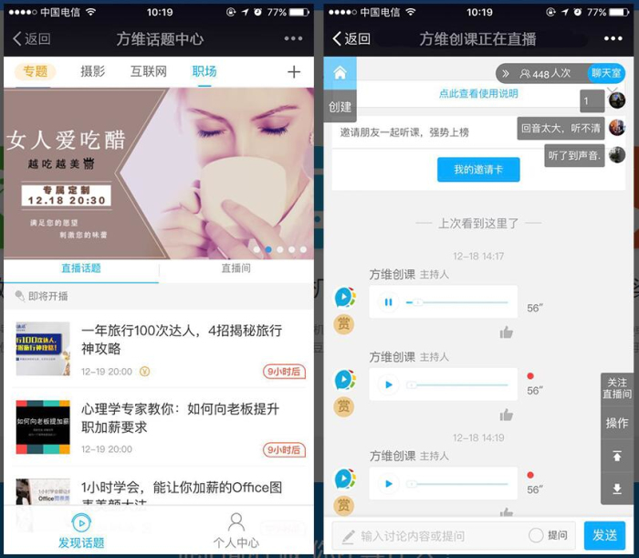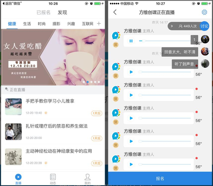 比起視頻直播帶給用戶的娛樂體驗(yàn),語音直播則更注重內(nèi)容的沉淀。類似專業(yè)培訓(xùn)、教學(xué)課程、脫口秀、廣播劇、名人課堂都已紛紛采用語音直播,這種形式的傳播支持在線語音互動,能將語音高效轉(zhuǎn)化、讓知識傳播沒有距離。