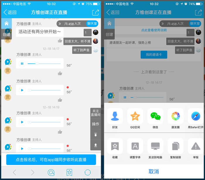 基礎(chǔ)的直播功能:支持一鍵轉(zhuǎn)發(fā)朋友圈和微信群,用戶僅需點(diǎn)擊鏈接就能收聽直播,通過方便快捷的用戶體驗(yàn),助您快速擴(kuò)大平臺的影響力!
