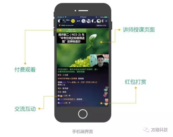 將方維內(nèi)容付費(fèi)直播系統(tǒng)接入在線教育平臺(tái)系統(tǒng),平臺(tái)入駐教師利用手機(jī)或其他設(shè)備均可進(jìn)行直播,在線即可互動(dòng)交流、共享講義,部分直播間付費(fèi)可觀看。可容納百萬人同時(shí)在線觀看,全網(wǎng)加速高清直播無卡頓。