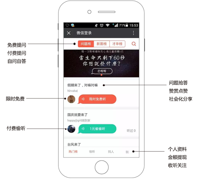 ■一元偷偷聽:用戶可以付費1元“偷偷聽”,偷聽費用將由提問者和回答者平分,每人0.5元。