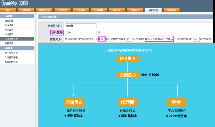平臺(tái)可發(fā)展代理商,代理商可發(fā)展分銷員,分銷員再發(fā)展分銷員。平臺(tái)運(yùn)營方可以在系統(tǒng)總后臺(tái)設(shè)置分銷員的入會(huì)門檻。