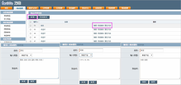 更新后,運(yùn)營人員可在后臺(tái)直接添加商品類型,并自定義編輯商品的屬性:
