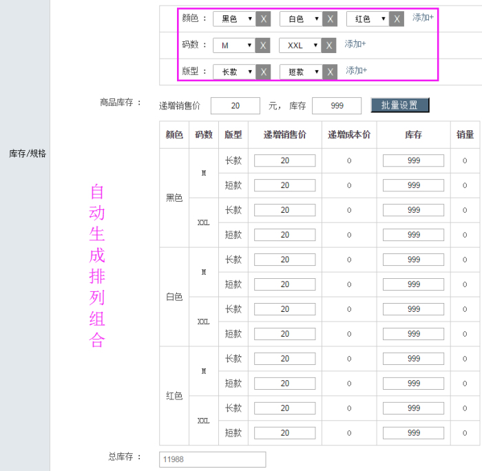更新商品的分類和屬性設(shè)置好了之后,系統(tǒng)會(huì)在此基礎(chǔ)上自動(dòng)生成商品所有可選項(xiàng)的排列組合,運(yùn)營人員再也不用手動(dòng)一項(xiàng)一項(xiàng)地輸入,大大提高效率的同時(shí)也避免了疏漏,簡(jiǎn)直不能更人性化了!