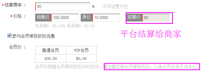 假設(shè)某商家以100售出某商品,平臺(tái)將結(jié)算費(fèi)率設(shè)置為80%,則平臺(tái)需結(jié)算給商家80元,抽利20元。