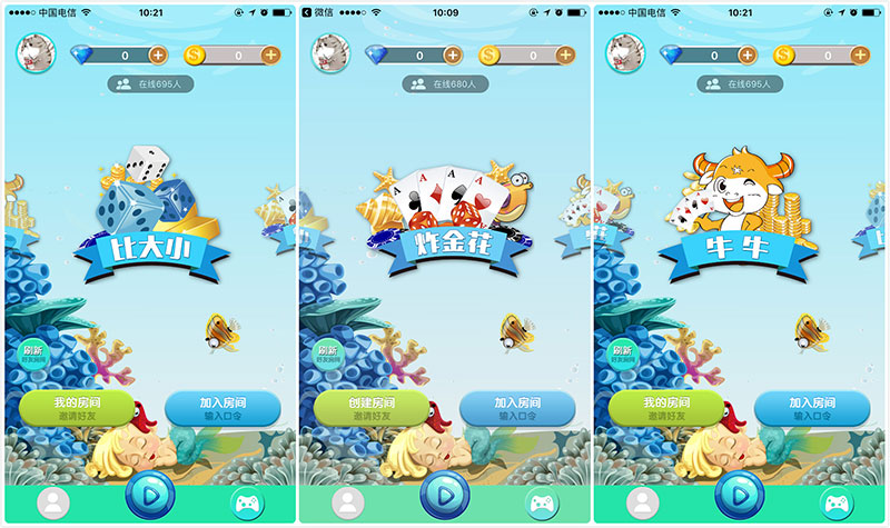 會(huì)員可在游戲窗口,選擇心儀的游戲類型創(chuàng)建房間及游戲??蛇x游戲有:炸金花、牛牛、比大小等等。