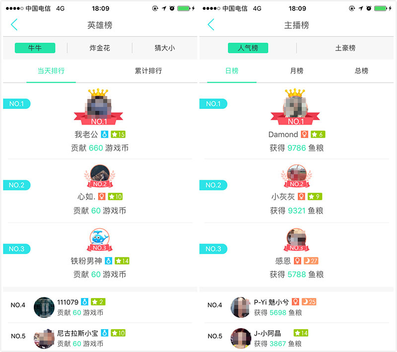 也可查看各個(gè)游戲英雄榜,查看牛牛、炸金花、猜大小游戲的當(dāng)天排行及累計(jì)排行情況。